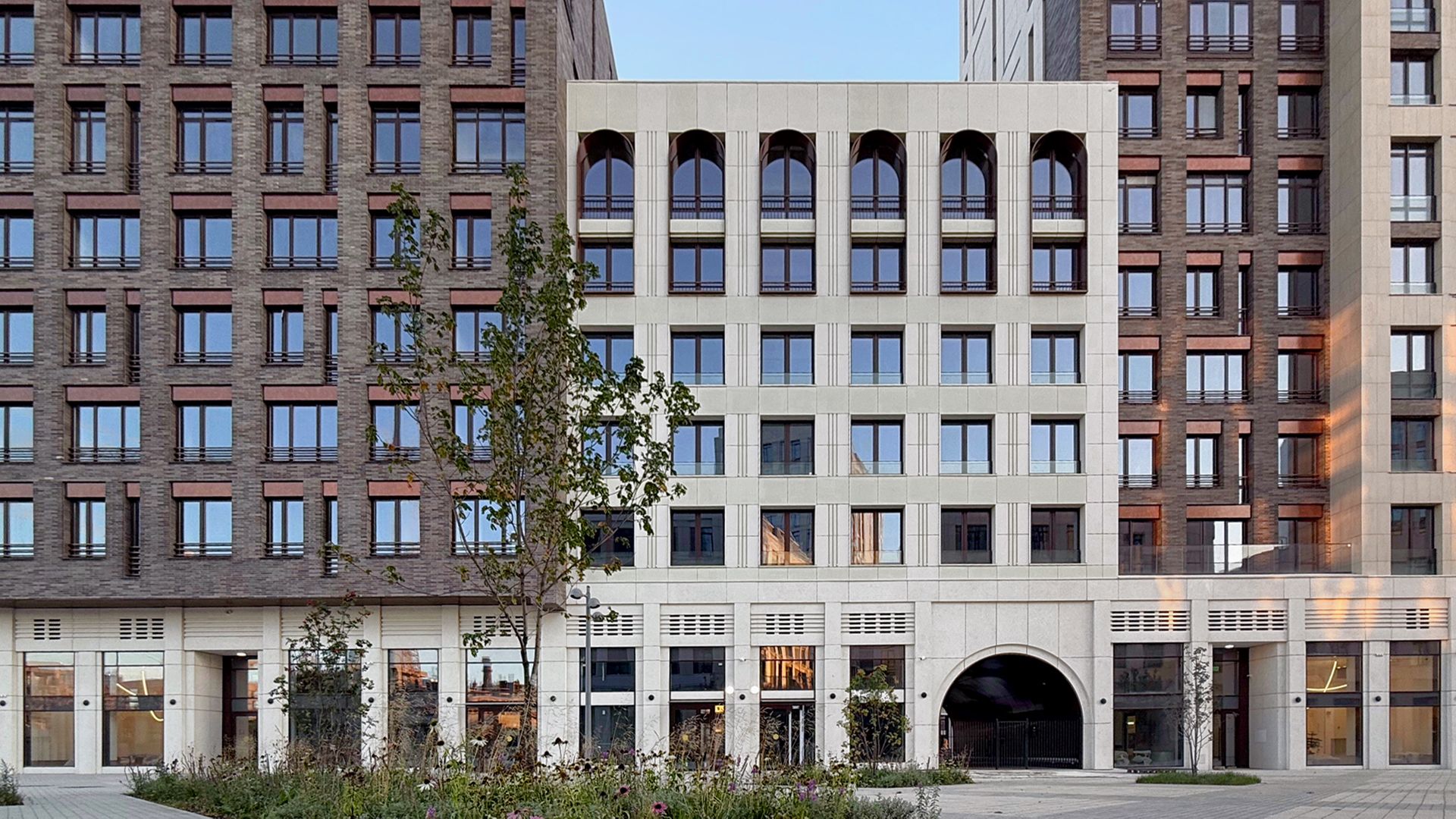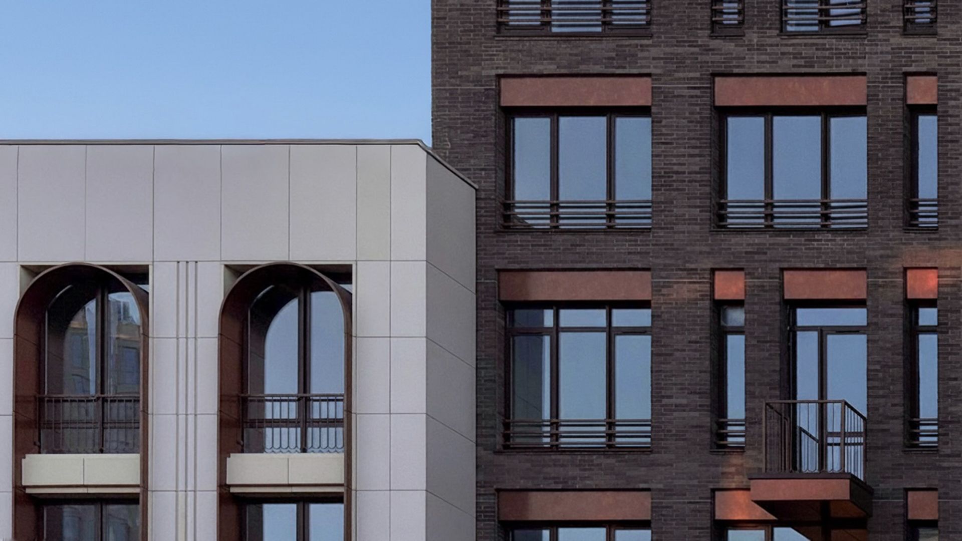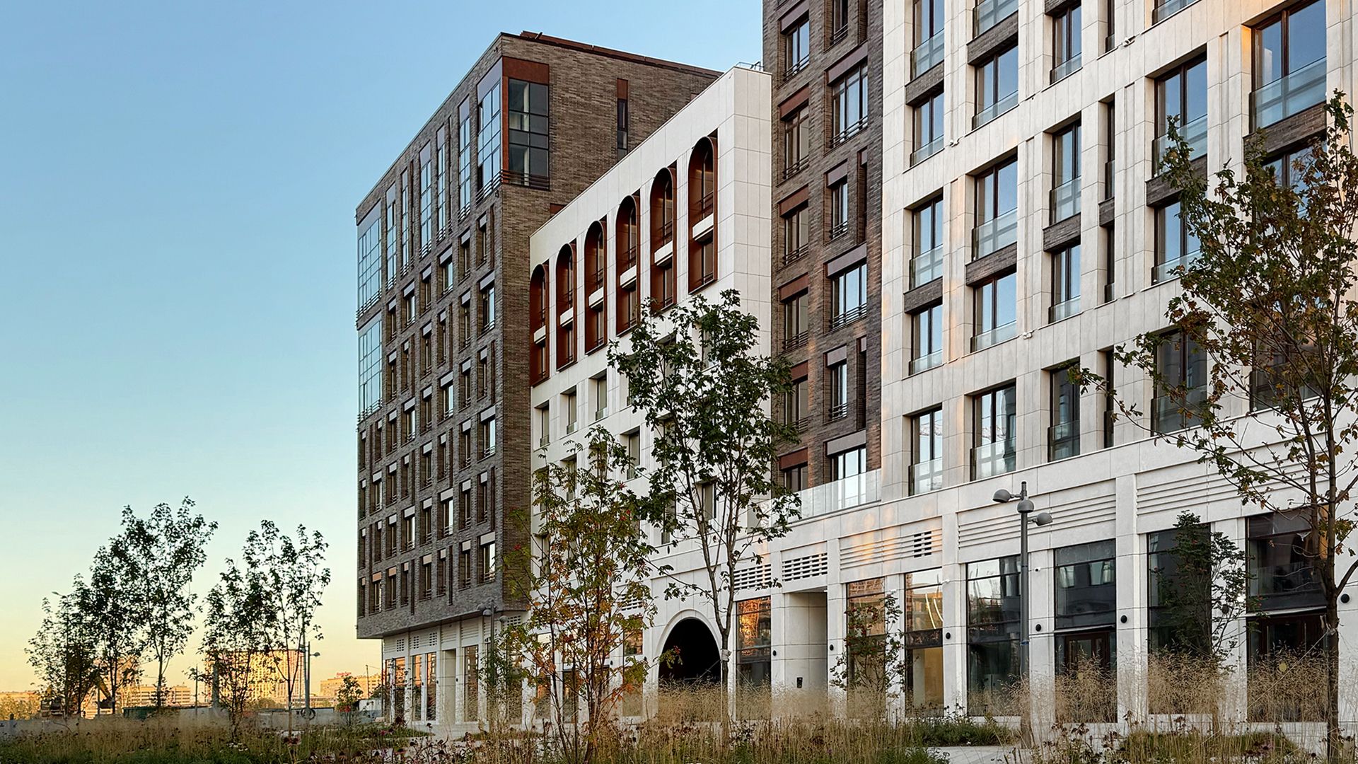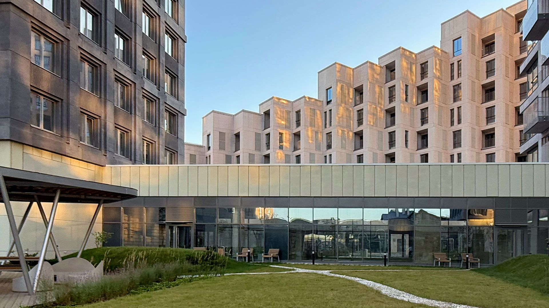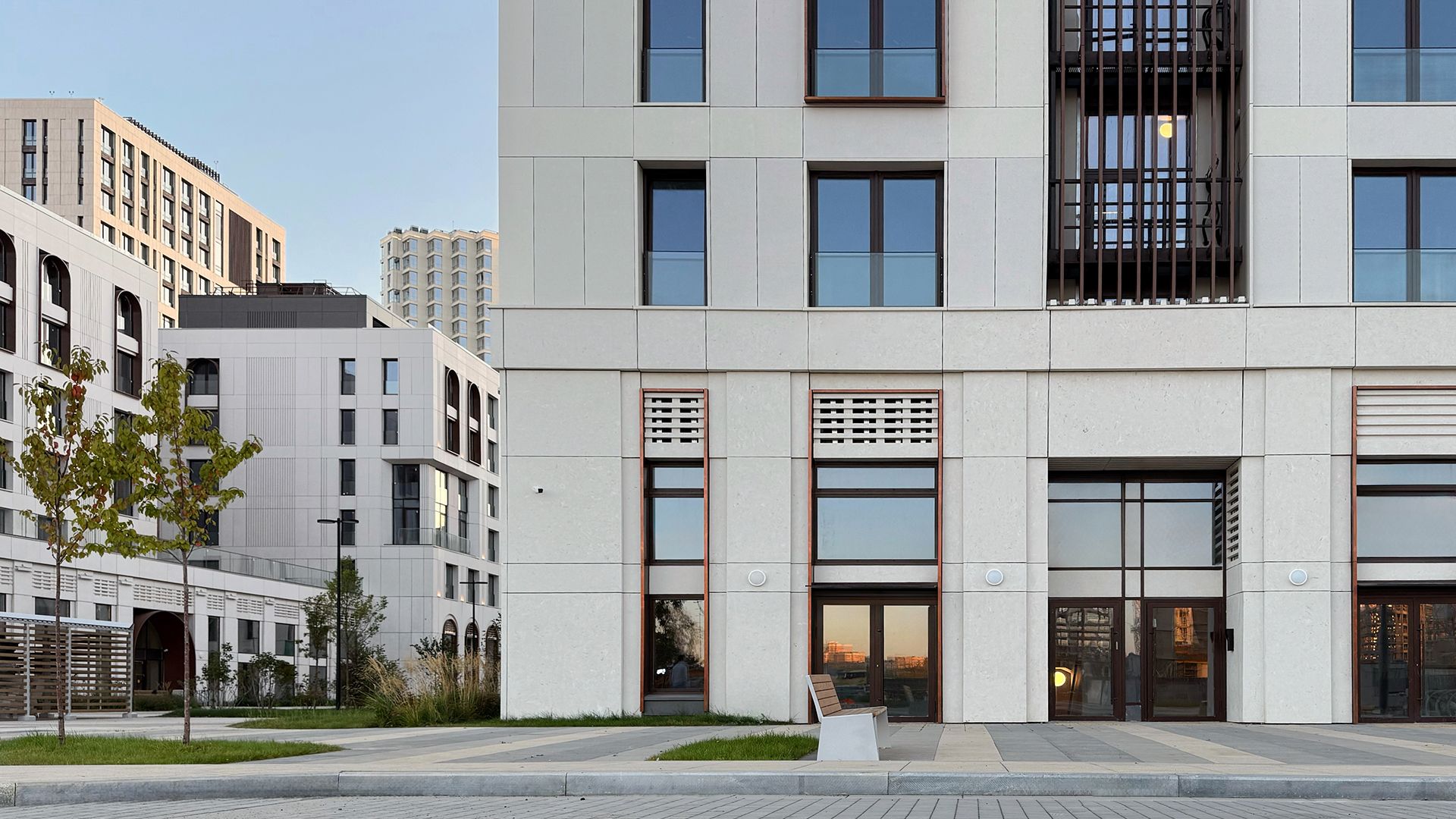 Проектировщики из Buromoskow создали здания в уникальном дизайне. Яркие и легкие фасады придают зданиям воздушность. Здание, состоящее из двух башен и соединённое стилобатом с центральным мостом, отличается медными оттенками, которые в лучах закатного солнца сияют, напоминая маяк. Здания от 3 до 11 этажей имеют форму угловой пирамиды, которая сужается к вершине. Помимо таунхаусов, здесь представлены квартиры с личными и общими террасами. А благодаря отсутствию внутренней отделки, будущие жители могут обустроить своё пространство по своему усмотрению.