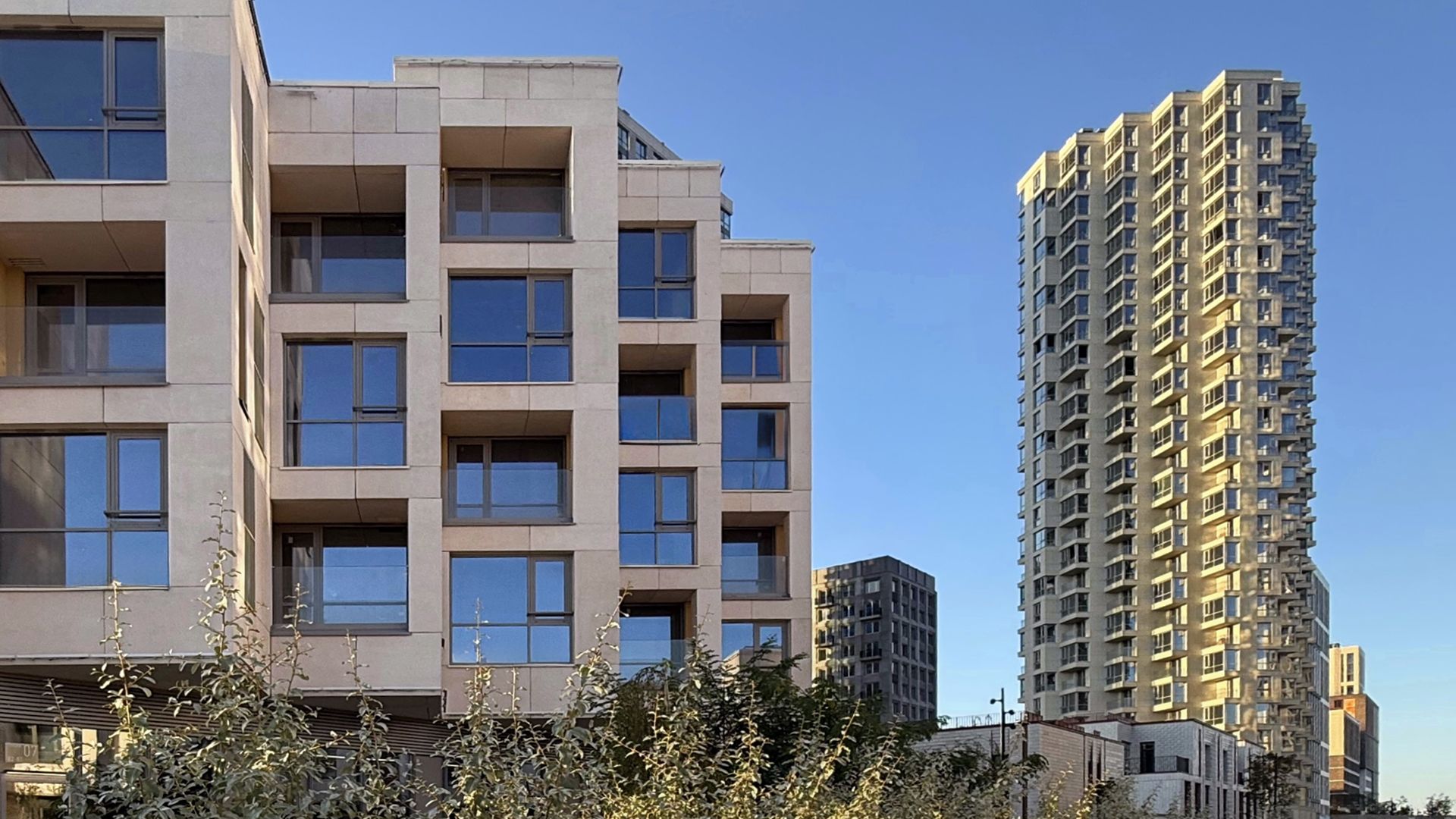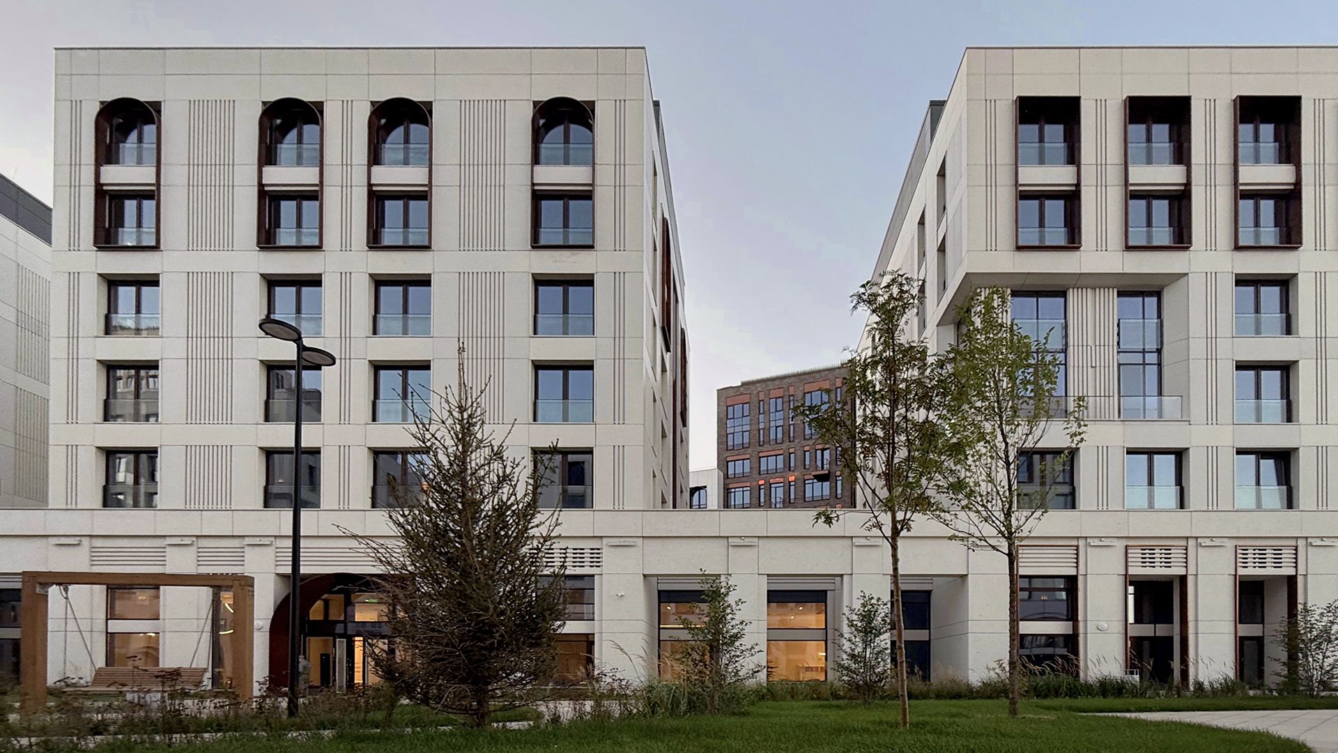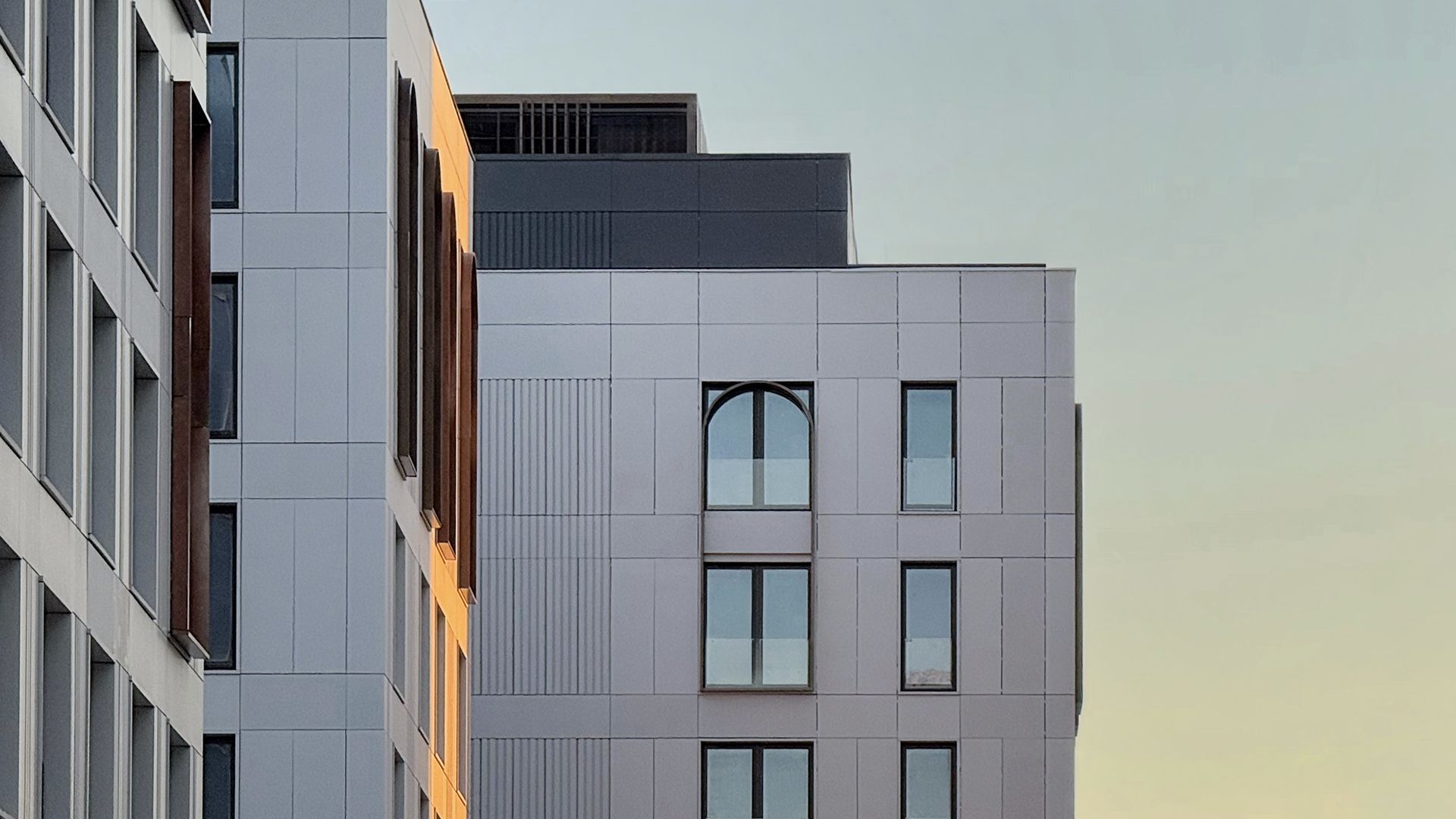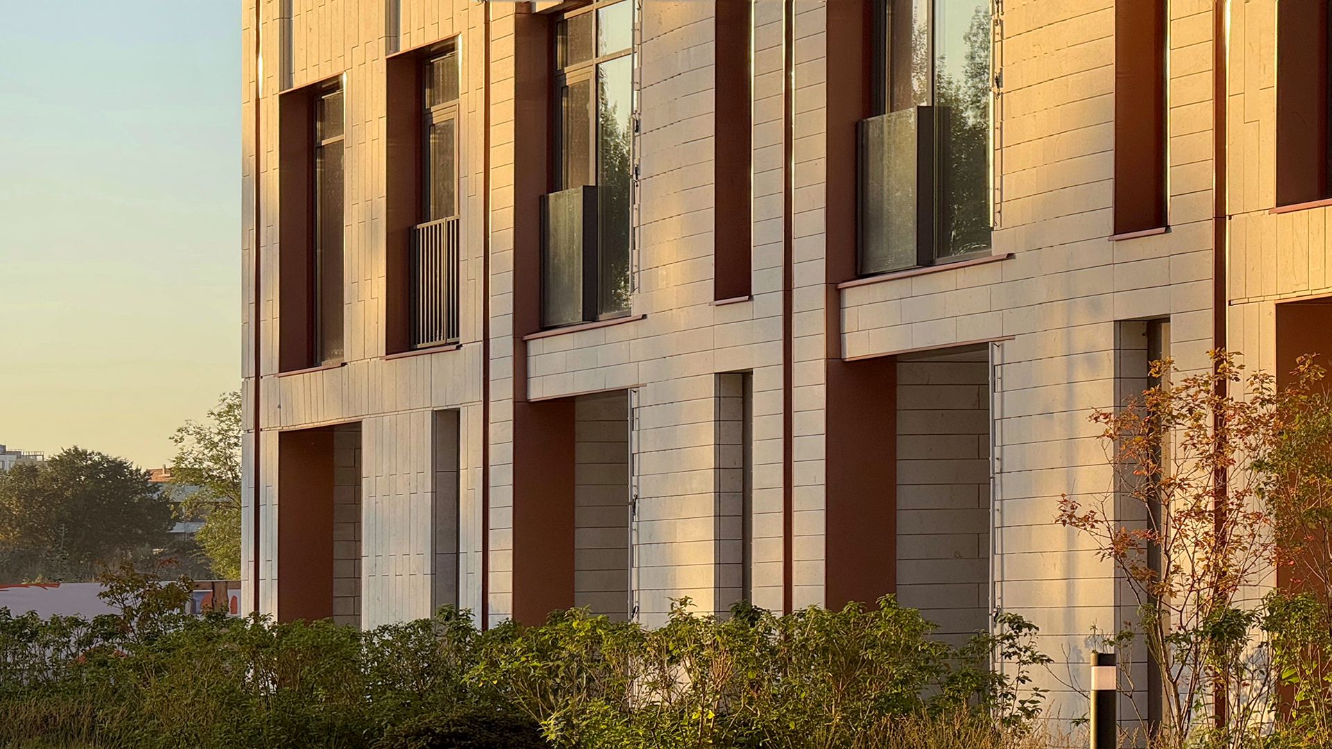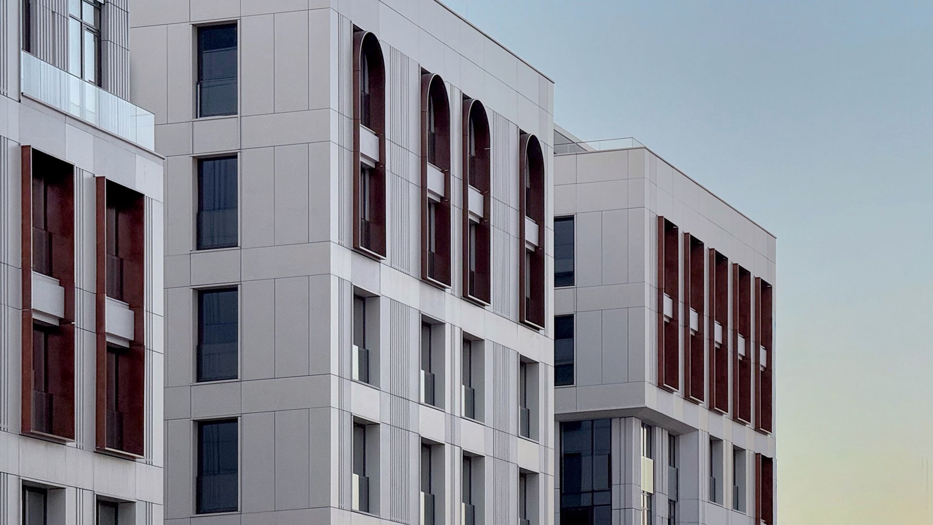 Проектировщики из Buromoskow создали здания в уникальном дизайне. Яркие и легкие фасады придают зданиям воздушность. Здание, состоящее из двух башен и соединённое стилобатом с центральным мостом, отличается медными оттенками, которые в лучах закатного солнца сияют, напоминая маяк. Здания от 3 до 11 этажей имеют форму угловой пирамиды, которая сужается к вершине. Помимо таунхаусов, здесь представлены квартиры с личными и общими террасами. А благодаря отсутствию внутренней отделки, будущие жители могут обустроить своё пространство по своему усмотрению.